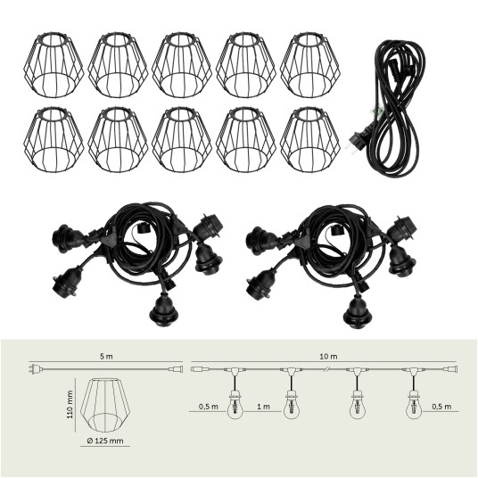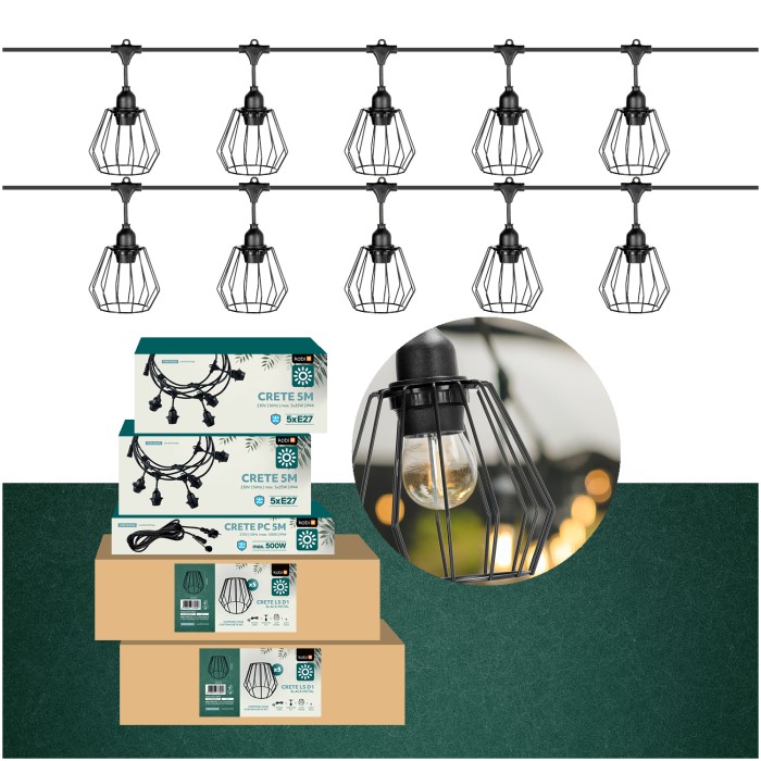 Zestaw CRETE 10 m to gotowe rozwiązanie do stworzenia efektownego oświetlenia ogrodowego, tarasowego, restauracji lub strefy eventowej. System modułowy pozwala na łatwą rozbudowę instalacji i dopasowanie jej długości do przestrzeni. W komplecie otrzymujesz dwa 5-metrowe odcinki girlandy, przewód zasilający 5 m oraz 10 metalowych, ażurowych kloszy D1 w kolorze czarnym.