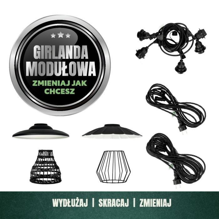 System jest w pełni modułowy – możesz wydłużyć instalację, zmienić wzór kloszy (4 dostępne modele), dobrać dowolne żarówki E27, aby zmienić charakter światła. To rozwiązanie, które sprawdzi się zarówno w małym ogrodzie, jak i w dużej przestrzeni komercyjnej.
