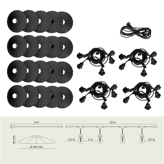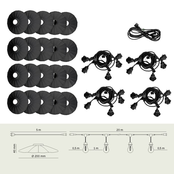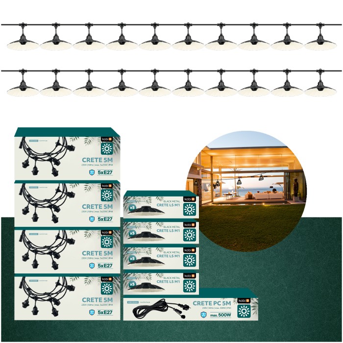 Zestaw CRETE 20 m to gotowe rozwiązanie do stworzenia efektownego oświetlenia ogrodowego, tarasowego, restauracji lub strefy eventowej. System modułowy pozwala na łatwą rozbudowę instalacji i dopasowanie jej długości do przestrzeni. W komplecie otrzymujesz cztery 5-metrowe odcinki girlandy, przewód zasilający 5 m oraz 20 metalowych kloszy M1 w kolorze czarnym.
