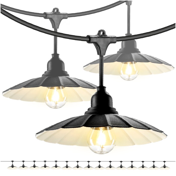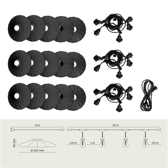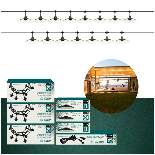 Zestaw CRETE 15 m to gotowe rozwiązanie do stworzenia efektownego oświetlenia ogrodowego, tarasowego, restauracji lub strefy eventowej. System modułowy pozwala na łatwą rozbudowę instalacji i dopasowanie jej długości do przestrzeni. W komplecie otrzymujesz trzy 5-metrowe odcinki girlandy, przewód zasilający 5 m oraz 15 metalowych kloszy M1 w kolorze czarnym.
