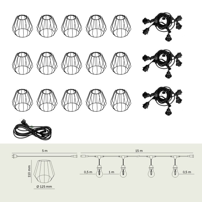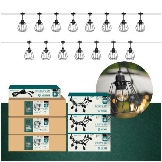 Zestaw CRETE 15 m to gotowe rozwiązanie do stworzenia efektownego oświetlenia ogrodowego, tarasowego, restauracji lub strefy eventowej. System modułowy pozwala na łatwą rozbudowę instalacji i dopasowanie jej długości do przestrzeni. W komplecie otrzymujesz trzy 5-metrowe odcinki girlandy, przewód zasilający 5 m oraz 15 metalowych, ażurowych kloszy D1 w kolorze czarnym.