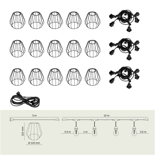 ZESTAW CRETE Girlanda ogrodowa 15 m + kabel 5 m + 15× klosz D1 Kobi Design