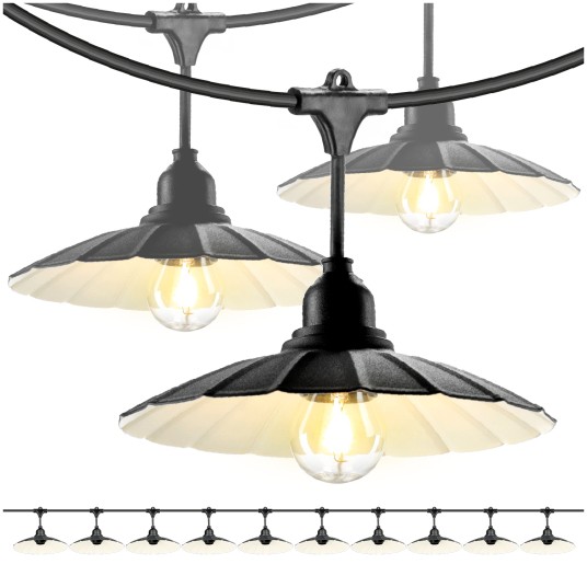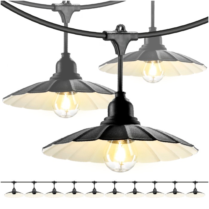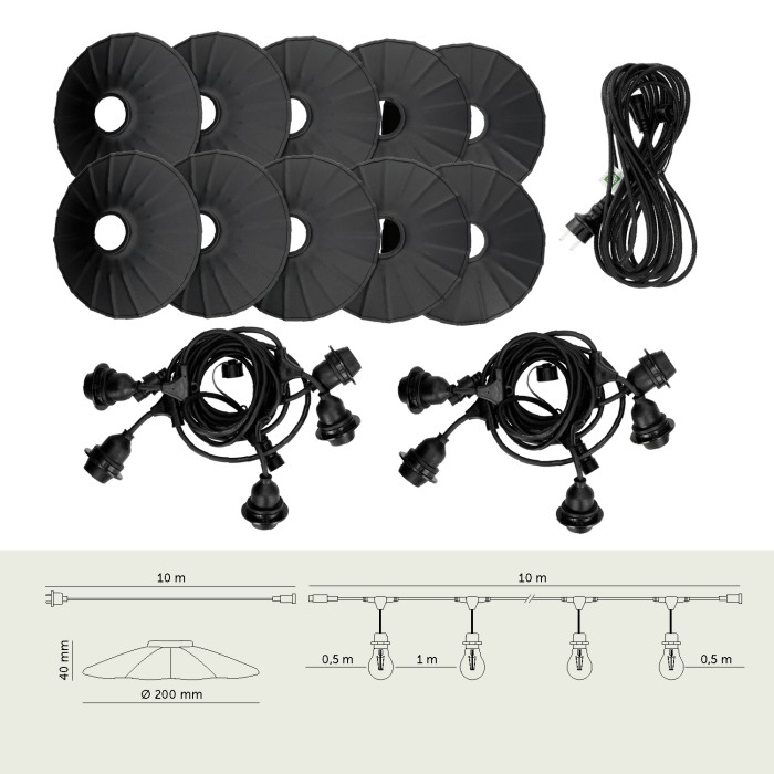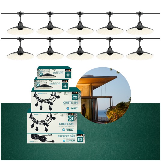 Zestaw CRETE 10 m to gotowe rozwiązanie do stworzenia efektownego oświetlenia ogrodowego, tarasowego, restauracji lub strefy eventowej. System modułowy pozwala na łatwą rozbudowę instalacji i dopasowanie jej długości do przestrzeni. W komplecie otrzymujesz dwa 5-metrowe odcinki girlandy, przewód zasilający 10 m oraz 10 metalowych kloszy M1 w kolorze czarnym.