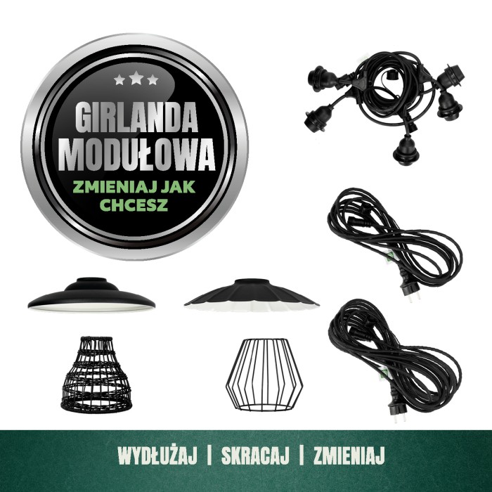 System jest w pełni modułowy – możesz wydłużyć instalację, zmienić wzór kloszy (4 dostępne modele), dobrać dowolne żarówki E27, aby zmienić charakter światła. To rozwiązanie, które sprawdzi się zarówno w małym ogrodzie, jak i w dużej przestrzeni komercyjnej.
