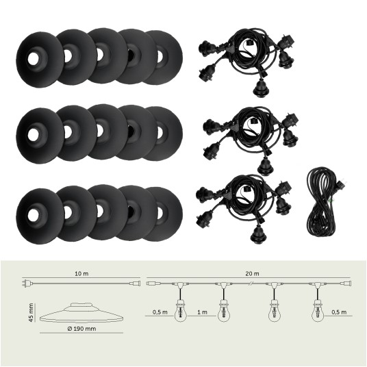 Zestaw CRETE 15 m to gotowe rozwiązanie do stworzenia efektownego oświetlenia ogrodowego, tarasowego, restauracji lub strefy eventowej. System modułowy pozwala na łatwą rozbudowę instalacji i dopasowanie jej długości do przestrzeni. W komplecie otrzymujesz trzy 5-metrowe odcinki girlandy, przewód zasilający 10 m oraz 15 metalowych kloszy M2 w kolorze czarnym.