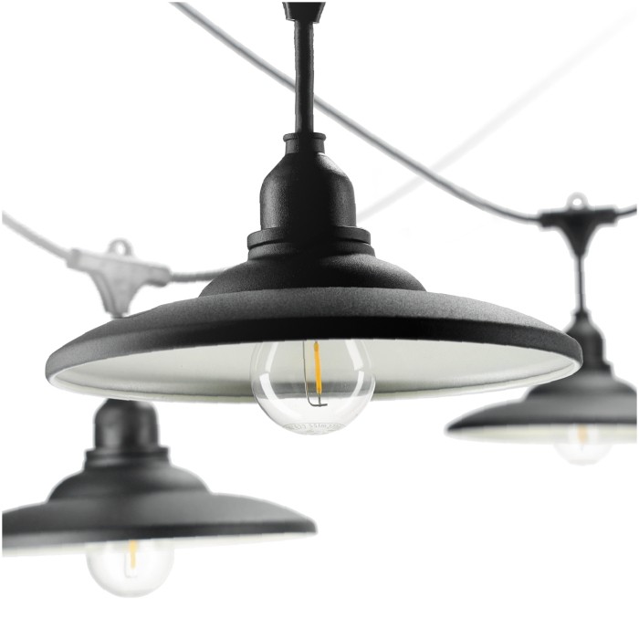 System jest w pełni modułowy – możesz wydłużyć instalację, zmienić wzór kloszy (4 dostępne modele), dobrać dowolne żarówki E27, aby zmienić charakter światła. To rozwiązanie, które sprawdzi się zarówno w małym ogrodzie, jak i w dużej przestrzeni komercyjnej.
